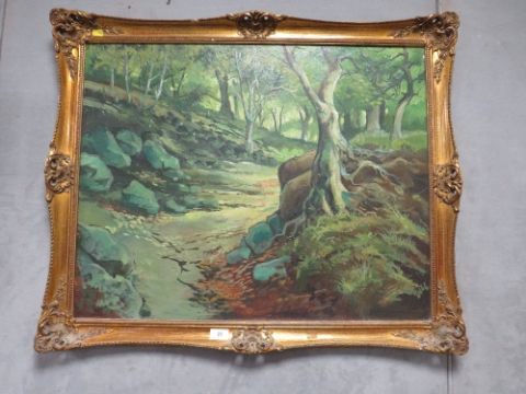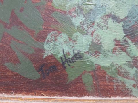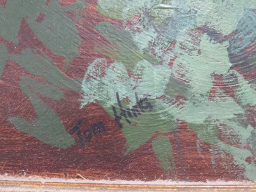 A gilt framed impressionist style oil on board depicting a woodland pathway, signed lower left Tom Hinks, 75 x 60 cm