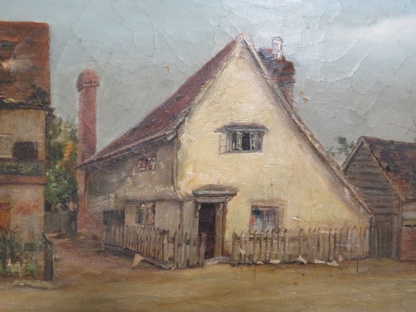 Naive school, 19th century oil on canvas of an old English cottage, part inscription to back 'old cottage' £3/10/- Mrs H.J. Roberton 37 x 27 cm overall