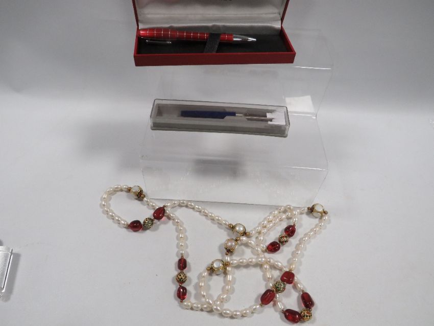 An assortment of costume jewellery and pens etc