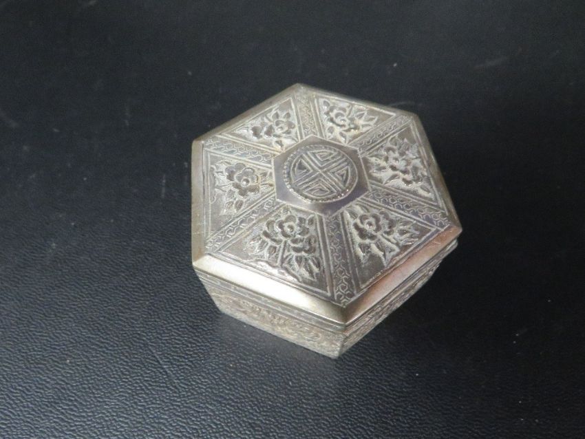 An antique Chinese white metal box of hexagon form with hinged lid, decorated with panels of flowers and mythical animals D. 6cm - W 57g