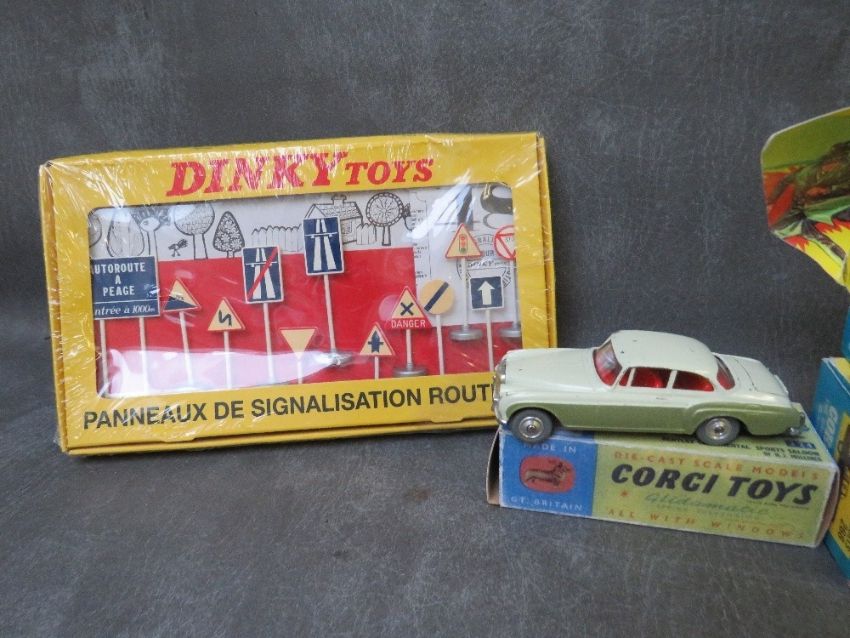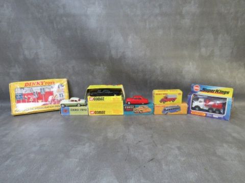 A BOXED CORGI GREEN HORNET BLACK BEAUTY 268, together with boxed Corgi Vauxhall Velox 203, boxed Corgi Bentley Continental 224, Matchbox Superkings K14 breakdown truck, Atlas Dinky Austin covered wagon 413 still factory wrapped, Atlas Dinky Autocar Isobloc 29E still factory wrapped, together with an Atlas Dinky route sign set still factory wrapped