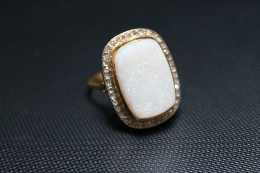 AN 18CT OPAL AND DIAMOND RING, the squared oval opal measuring approx 2 cm by 1.25 cm and surrounded by small brilliant cut diamonds, approx weight 10.4g, ring size K