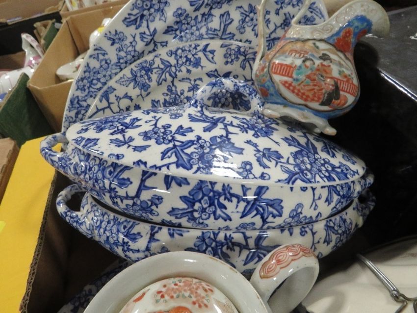 A box of ceramics to include blue & white, Portmeirion, Chinese items etc