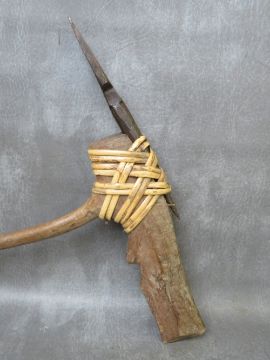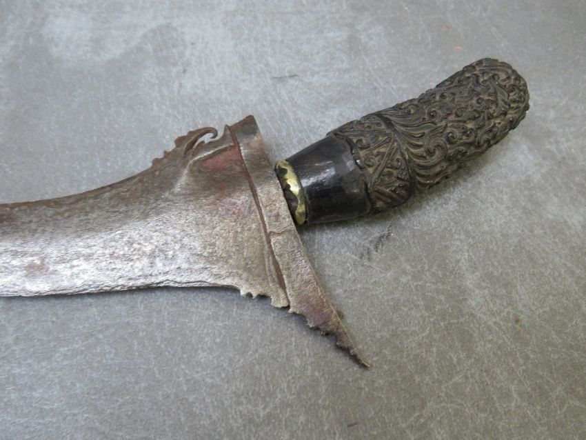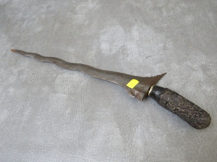 A 19TH CENTURY TRIBAL ART INDONESIAN JAVANESE KRIS KNIFE, with carved handle and a Balinese wooden axe (2)