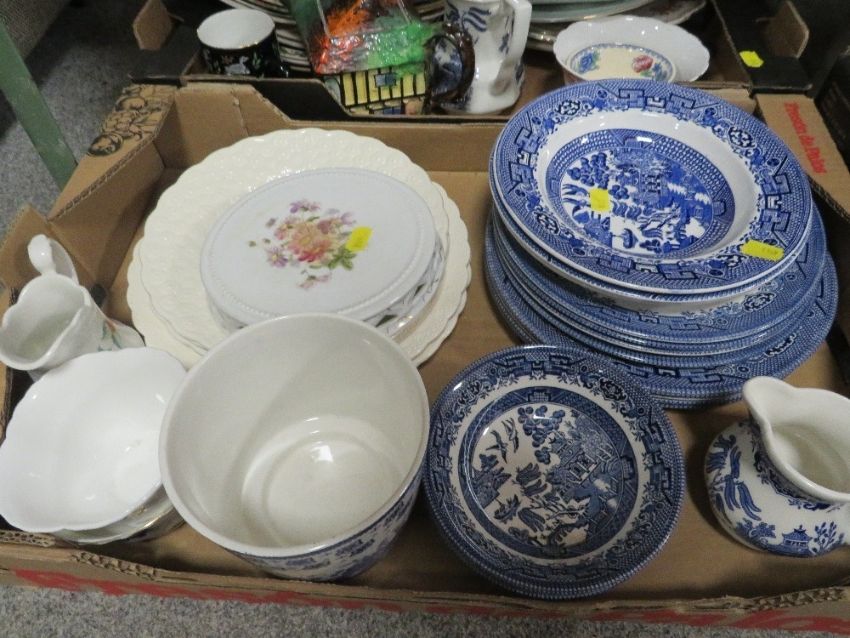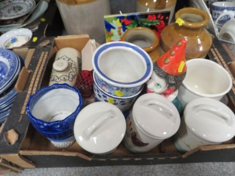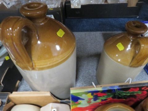 Three trays of assorted ceramics to include stoneware flagons etc