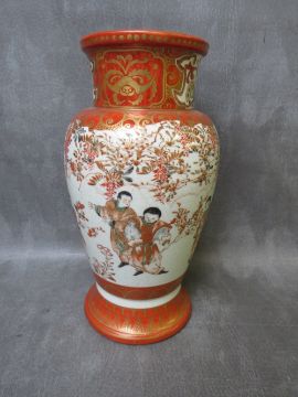 A JAPANESE LATE 19TH / EARLY 20TH CENTURY RED SATSUMA BALUSTER VASE, decorated with figures and flowers, four character marks to base, H 30.5 cm