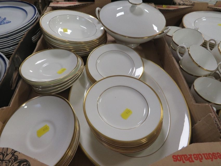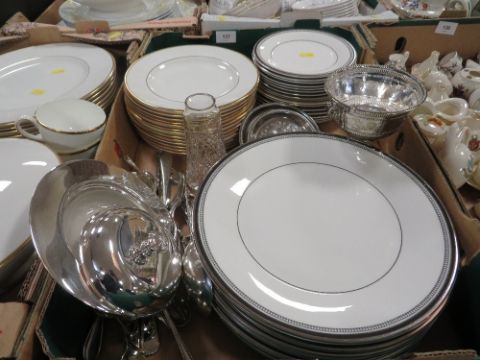 Three trays of mostly Wedgwood California dinner ware together with Royal Doulton Sarabande and a small quantity of metalware