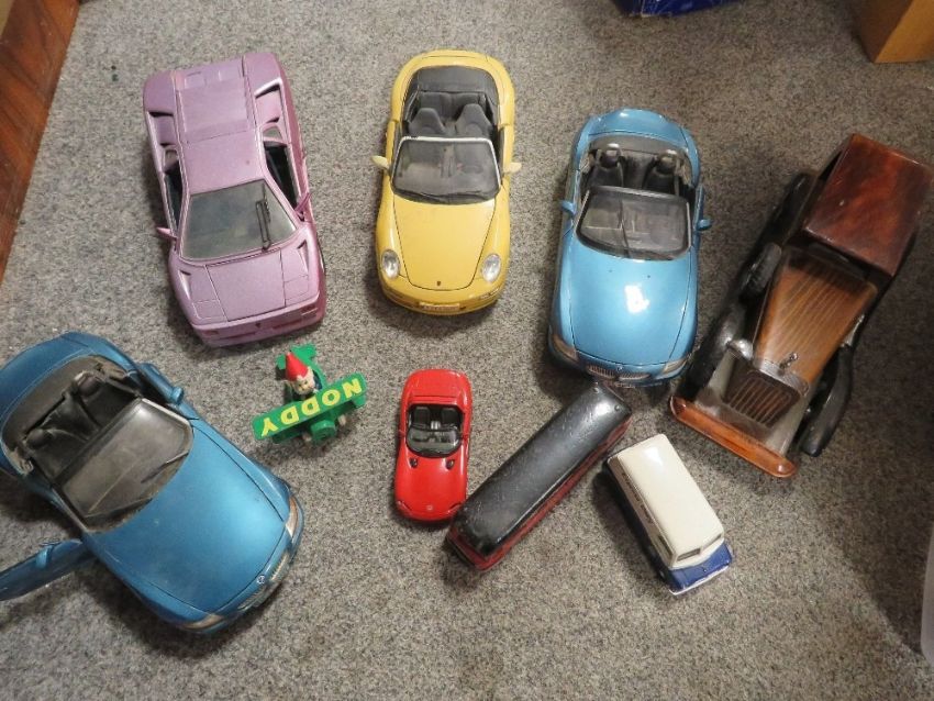 A tray of assorted vintage toy cars together with a tray of playing cards and dominos