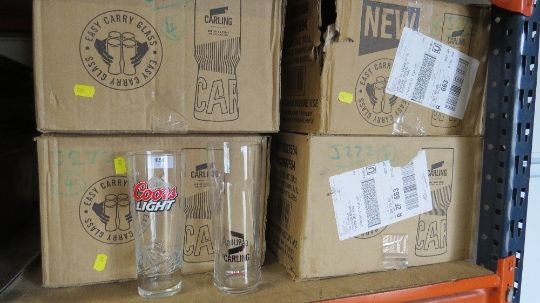 Four boxes of Carling Black Label pint glasses and Coors Light glasses