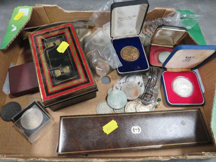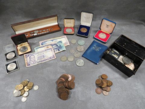 A tray of vintage coins, notes and collectables