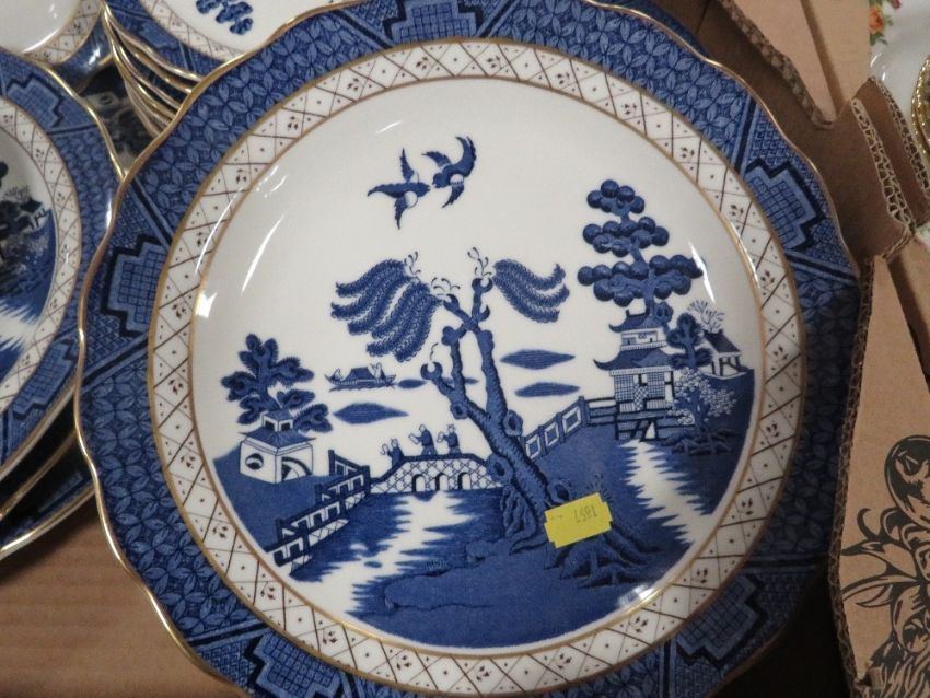 Two trays of Booths Blue & white Old Willow tea and dinnerware