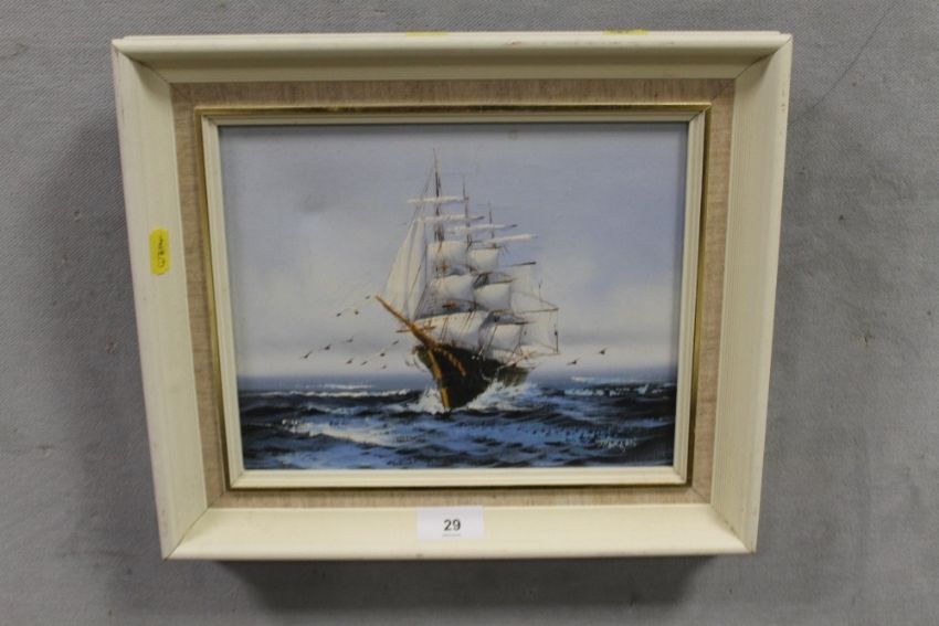 A modern oil on canvas depicting a sailing boat