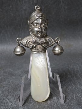 A HJALLMARKED SILVER BABY'S RATTLE, with mother of pearl handle, L 12 cm