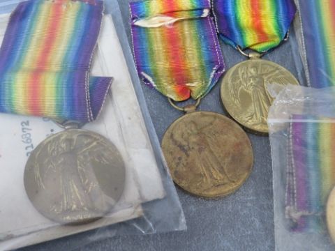 A WORLD WAR I CHRISTMAS 1914 TIN, together with five victory medals, various soldiers31660 PTE E JEFFREY YORK RM316872 PTE C F SENIOR A S CWR 11242 PNR F.W. MASTERS R.E.J 49151 H.R.BILLINGHAM A.B.R.N202437 PTE F. BEARDSLEY DURM.L.I.