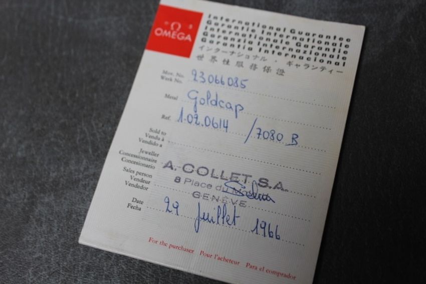 OMEGA - A BOXED AUTOMATIC SEAMASTER DE VILLE WRIST WATCH, with both inner and outer box and coming with guarantee dated 1966, Dia 3.75 cm **Please Note: the clasp is worn and does not function correctly No marks to the dial with the naked eye - slight foxing observed under a x10 loupe. The date dial moves as it should. The lugs are not bent. The paperwork was supplied with the watch at the time of consignment - the watch has not been opened
