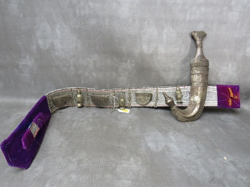 AN OMANI JAMBIYA DAGGER, in white metal scabbard, with decorative belt, blade L 17 cm, overall L 34 cm,, belt L 107 cm