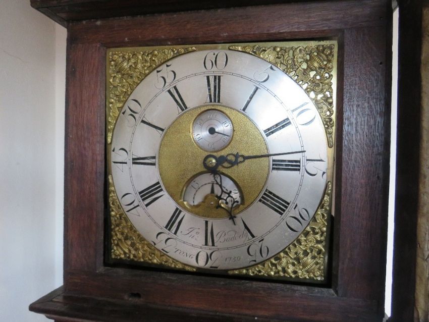 THOMAS BADDELY OF TONG - AN 18TH CENTURY OAK SHROPSHIRE LONGCASE CLOCK, with 30 hour movement, the gilt and silvered dial bearing makers name and dated 1750, inlaid detail to the trunk door, single weight and pendulum, H 205 cm