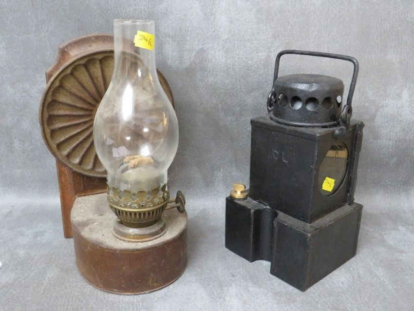 A WELCH PATENT RAILWAY LAMP, marked CL, along with a waiting room type wall mounted oil lamp (2)