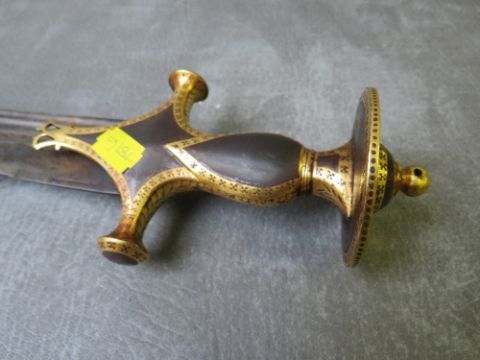 AN INDIAN TULWAR SWORD, with curved blade and iron grip, with gilded patterned borders and disc pommel, L 80 cm