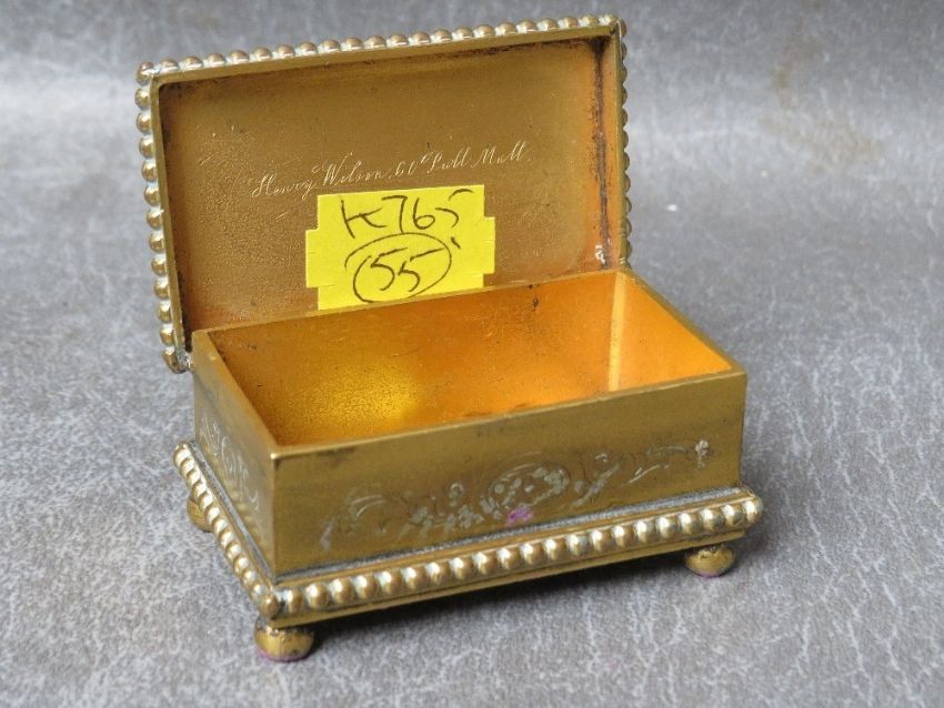 A 19TH CENTURY GILT METAL VESTA BOX, H 2 cm, W 5.5 cm, L 8.5 cm