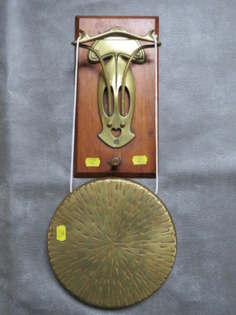 AN ART NOUVEAU BRASS AND OAK DINNER GONG, H 28 cm, gong Dia. 21 cm