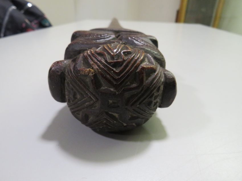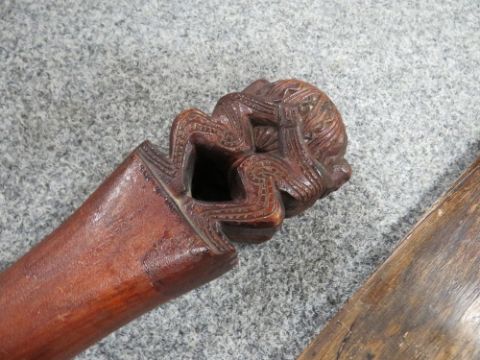 AN OCEANIC TRIBAL ART FRENCH POLYNESIAN AUSTRAL ISLANDS CARVED WALKING STICK, with back to back figures and large Solomon Islands carved paddle club