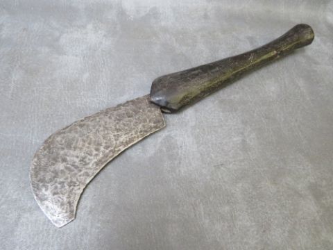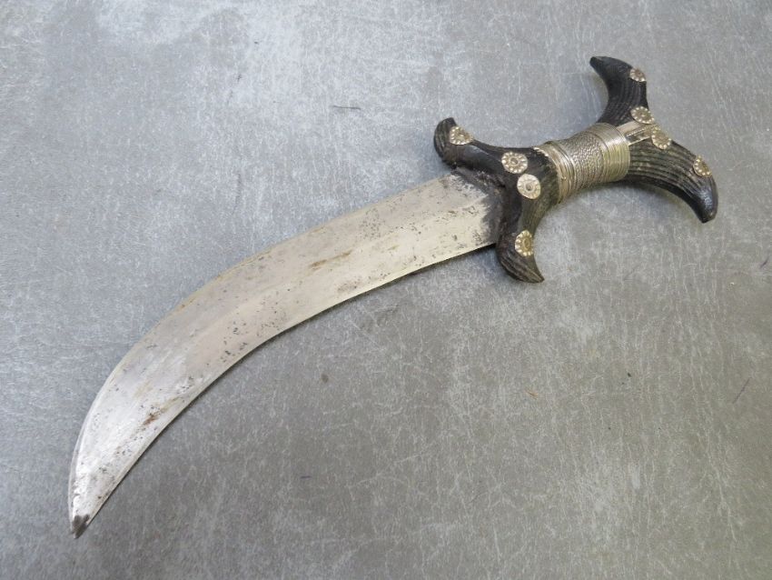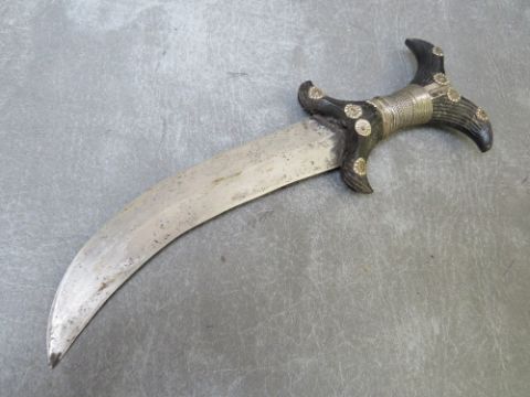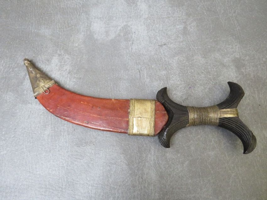 AN EAST AFRICAN SUDANESE BEJA TRIBAL ART KNIFE & LEATHER SHEATH, with fine white metal wirework , together with a sickle shaped machete knife