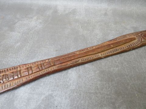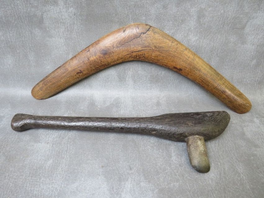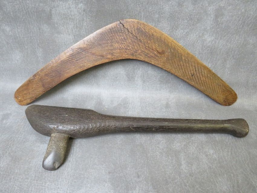 A TRIBAL ART AUSTRALIAN ABORIGINAL WOODEN CLUB, with inset stone axe head, a wooden boomerang and a carved woomera / spear throwerThere is no obvious signs of old or new woodworm to any itemThe Boomerang has a split to the centre of the body.The Wookera has a small piece broken off one endThe wooden club with stone axe head has a small piece broken off the tip of the head.No obvious repairs that we can see.