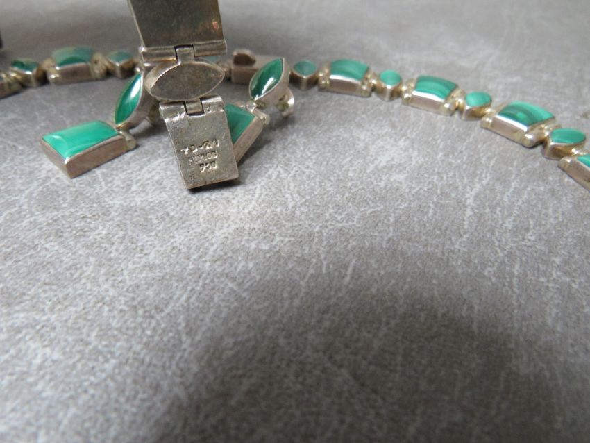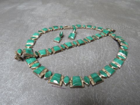 A VINTAGE MEXICAN SILVER & MALACHITE FOUR PIECE PARURE, stamped Mexico 950 to the necklace and bracelet, no obvious marks to the earrings