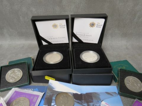 A COLLECTION OF ROYAL MINT COMMEMORATIVE CROWN COINS AND FIVE POUNDS, to include a 1935 Jubilee crown in modern case, 1977 silver proof crown in case, 1951 crown x 2 etc. (11)