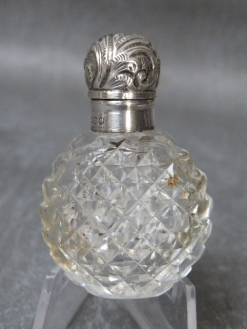 A 19TH CENTURY HALLMARKED SILVER TOPPED GLASS SCENT BOTTLE, H 5 cm, Dia. 3.5 cm