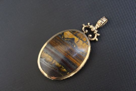 A HALLMARKED 9 CARAT GOLD MOUNTED POLISHED HARDSTONE PENDANT, with contrasting colours on each side, approx weight 22.3g, H 5.5 cm, W 2.75 cmCondition - No obvious damage or restoration