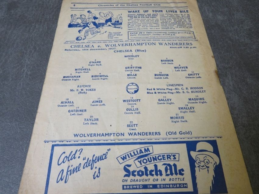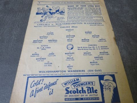 AN 18TH DECEMBER 1937 / 1938 SEASON CHELSEA v WOLVERHAMPTON WANDERERS FOOTBALL PROGRAMME, the last pre-was season Wolverhampton Wanderers went on to become league runners up during this season