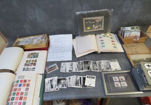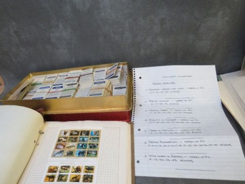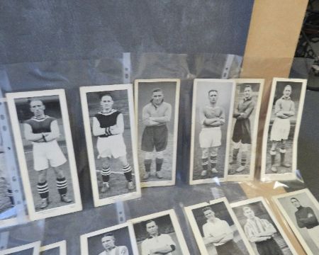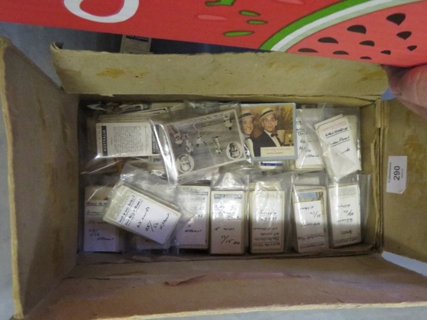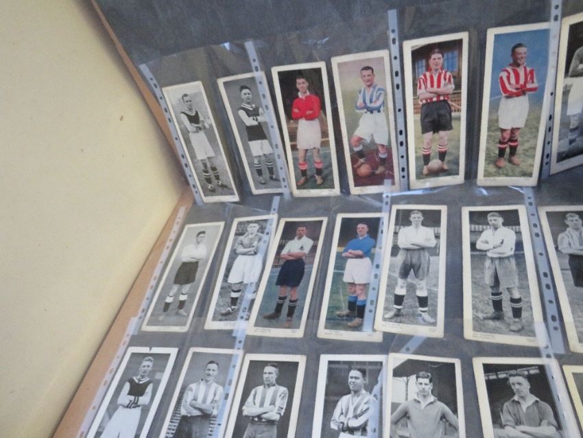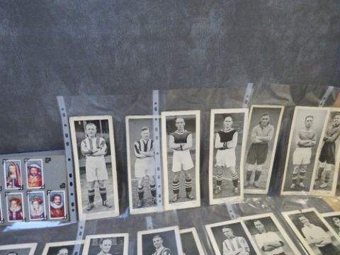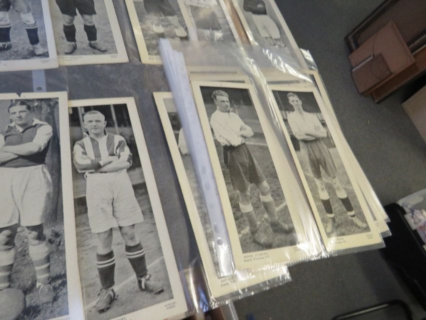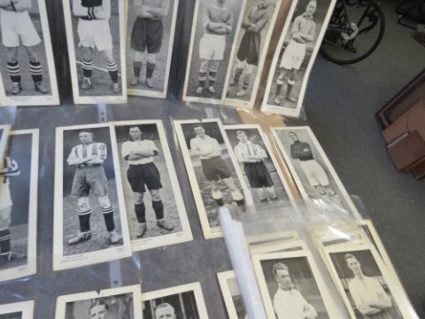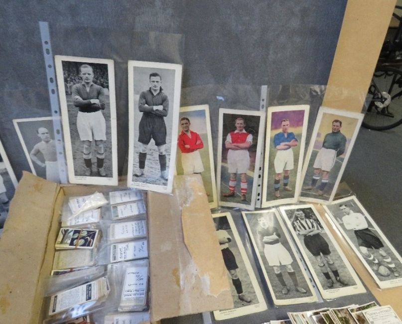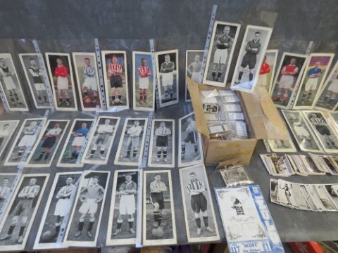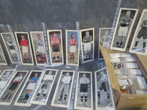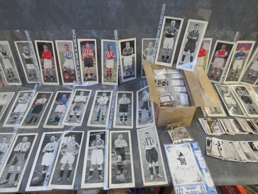 A LARGE JOB LOT OF EPHEMERA, to include a large collection of Topical Times Footballers - both colour and black & white, stamp albums, tea card albums and loose tea cards, post cards, collectors cards such as Modern Beauties etc., contained in two trays