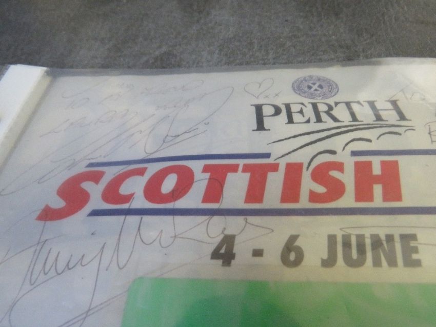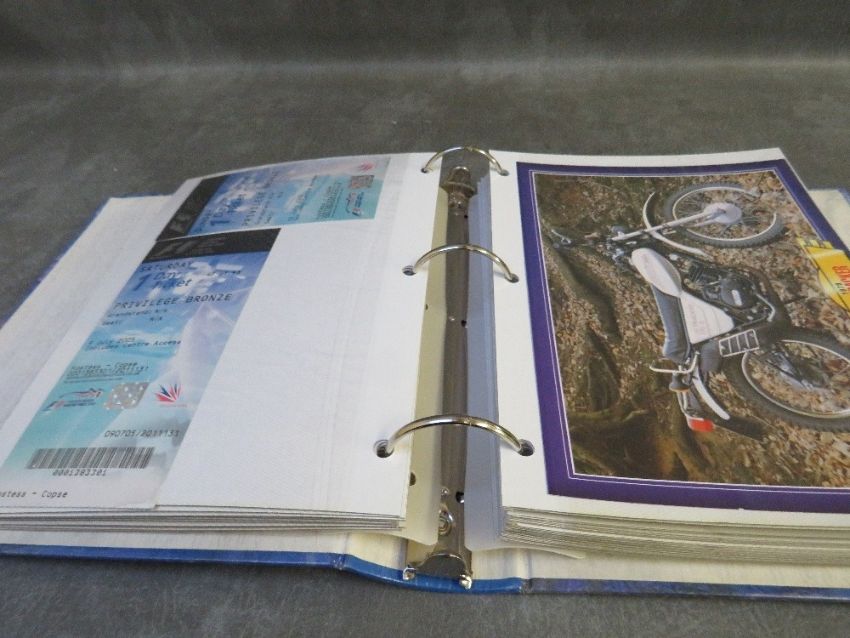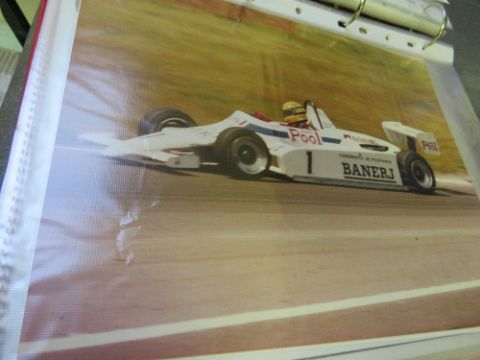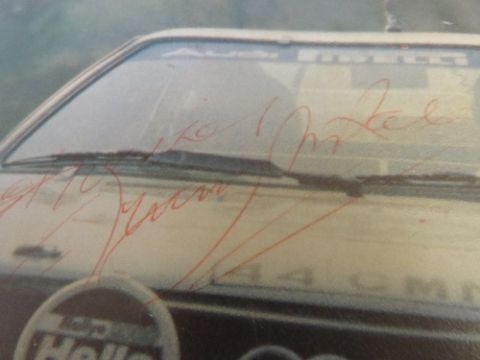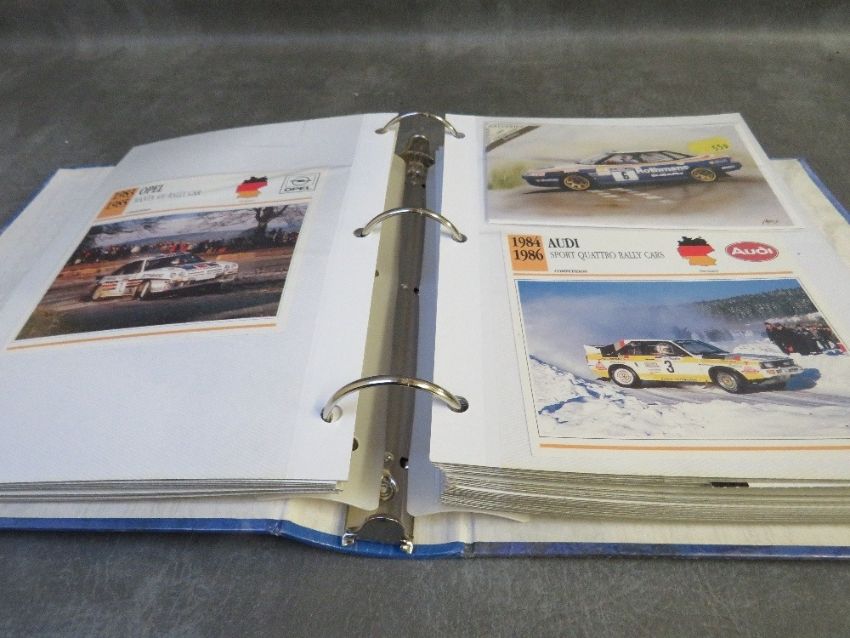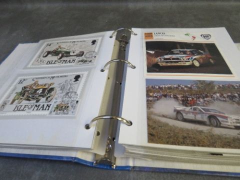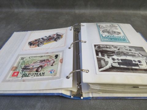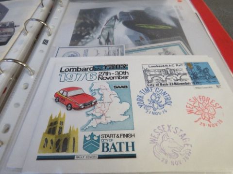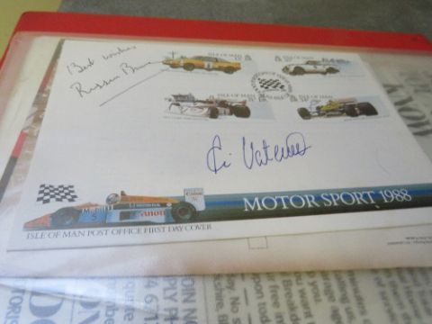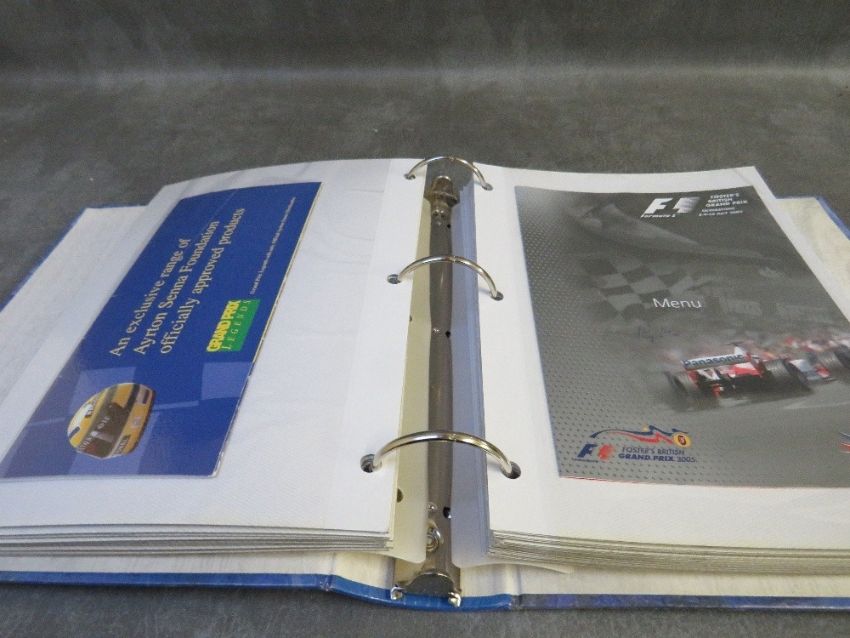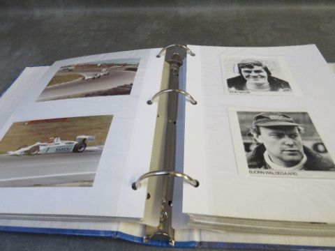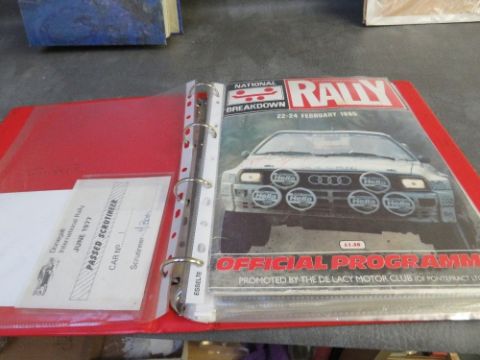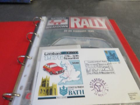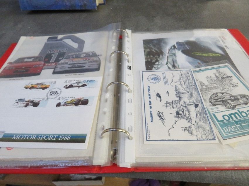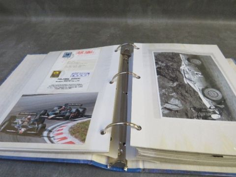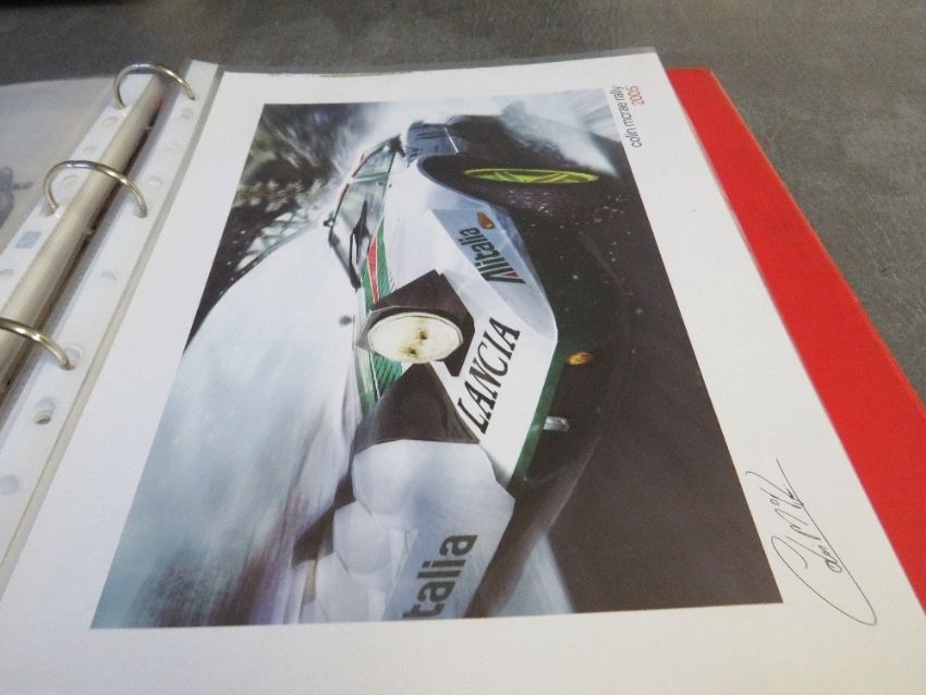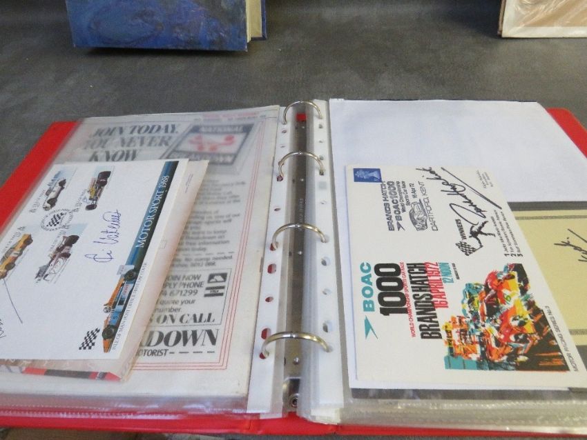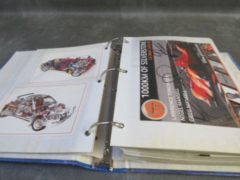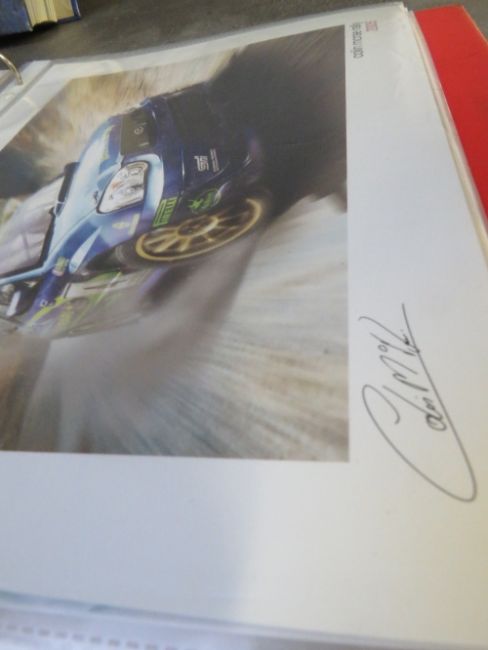 TWO ALBUMS CONTAINING RALLY AND FORMULA 1 ITEMS, mainly 1980s, to include many signed items etc., Russell Brookes, Colin McRae etc.