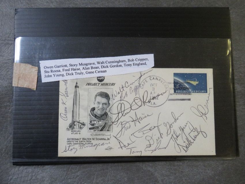 PROJECT MERCURY 1962 CAPE CANAVERAL SIGNED COVER, multiple signatures to include Owen Garriott, Story Musgrave, Walt Cunningham, Bob Crippen, Stu Roosa, Fred Haise, Alan Bean, Dick Gordon, Tony England, John Young, Dick Truly and Gene Cernan