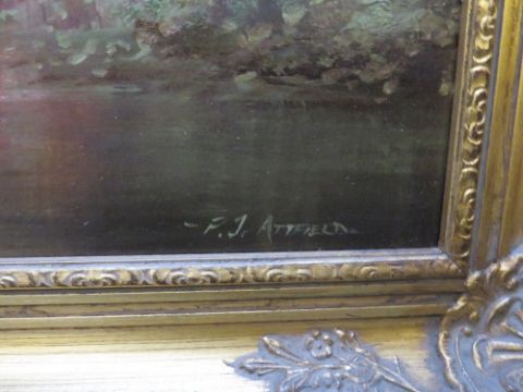 PAUL J. ATTFIELD (XX). English school, rural wooded river scene with cottage, mill and figure watching an artist painting, signed lower right, oil on canvas, framed 49 x 74 cm
