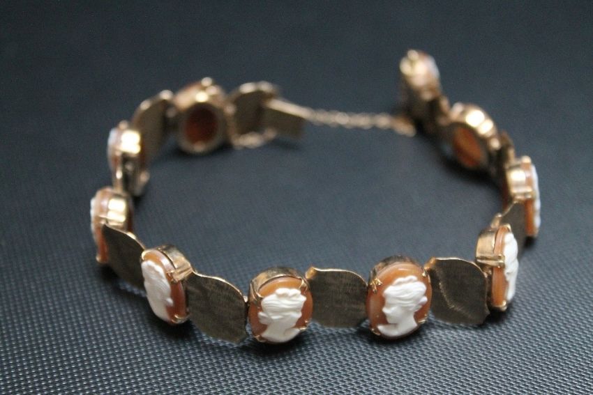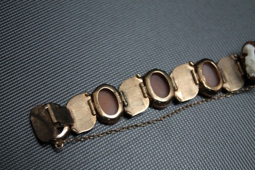 A HALLMARKED 9 CARAT GOLD CAMEO PANEL BRACELET, having alternating oval claw set cameos, approx weight 17.6g