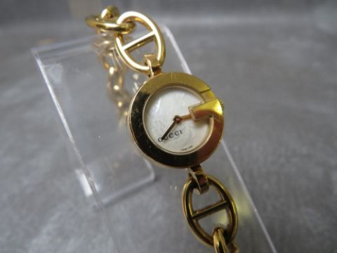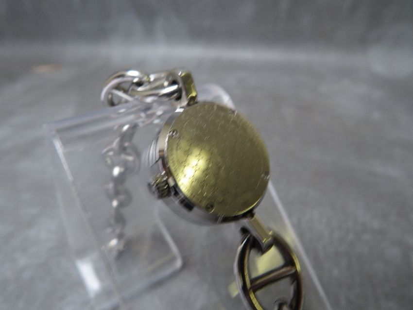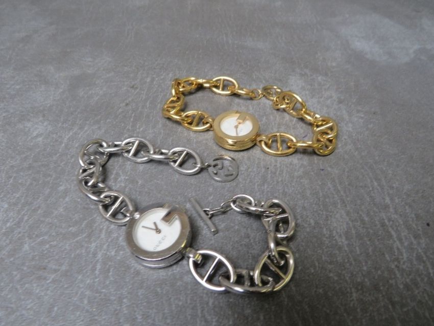 A LADIES DIAMOND SET GUCCI WRISTWATCH IN STAINLESS STEEL, the back of the case stamped Gucci 107 and 11341436 , together with a goldtone version of the same watch but lacking diamond set to case, also stamped 107 and 11070622 (2)