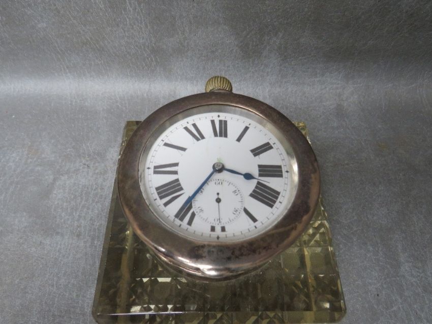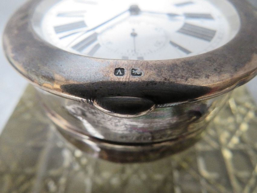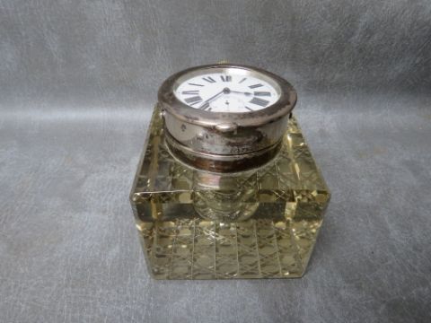 A HEAVY CUT GLASS INKWELL, with hallmarked silver swivel watch lid / cover