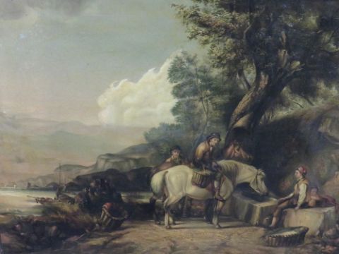 IN THE STYLE OF WILLIAM SHAYER, a 19th century coastal scene with boats, figures and horses, unsigned, oil on canvas, framed, 70 x 91 cm