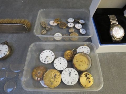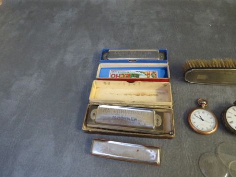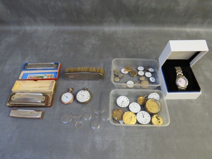 MIXED LOT OF COLLECTABLES, to include gents Stern and Lemann wristwatch, two tubs of watch parts, two pocket watches, hallmarked silver topped brush, three harmonicas, two of which are boxed and ten watch glasses