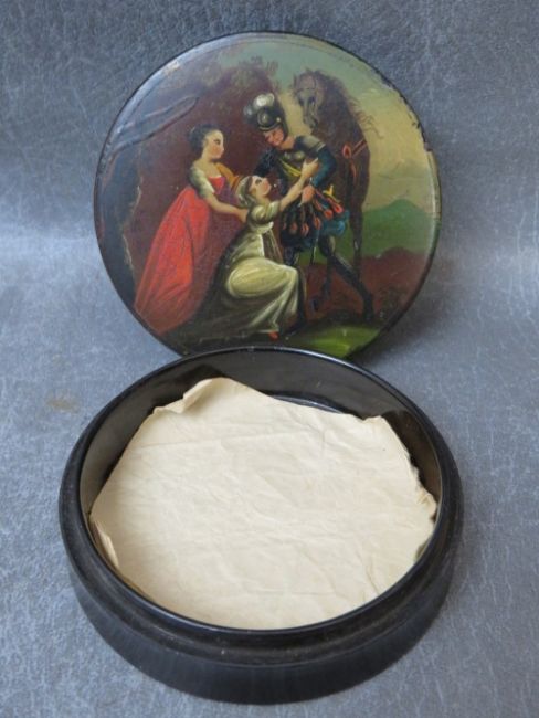 A GEORGIAN PAINTED PAPIER MACHE SNUFF BOX, depicting figures and a horse, Dia. 8.5 cm