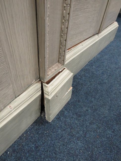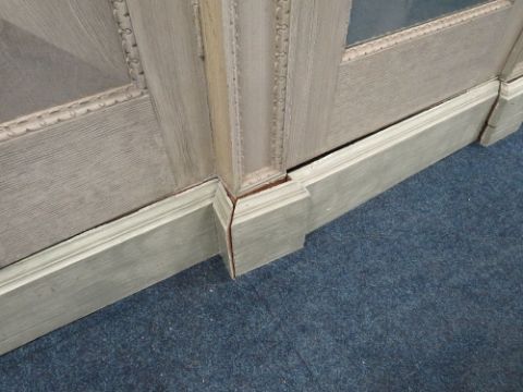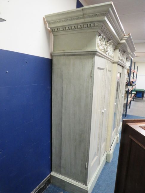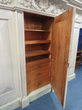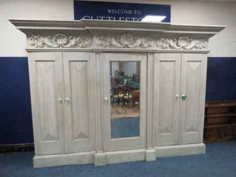A LARGE AND IMPRESSIVE BREAKFRONT PAINTED FIVE DOOR WARDROBE, the central mirrored door opening to reveal drawers and linen shelves, the twin doors to either side opening to reveal hanging space, raised on a plain plinth, having an elaborate rococo cornice, H 242 cm, W 340 cm, D 79 cm. NB: This is a 20th century adapted wardrobe with various adaptations, new timbers throughout and it will need to be de-constructed to remove and re-assembled