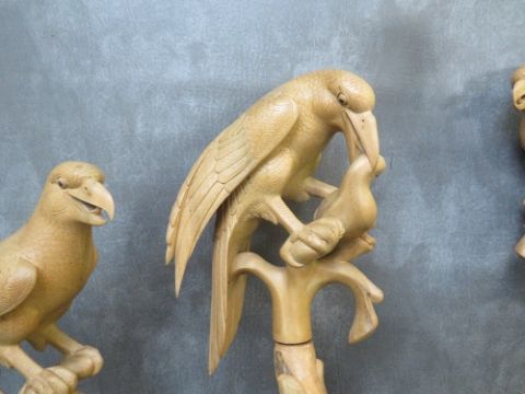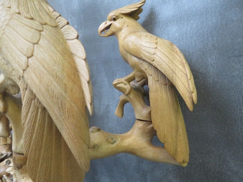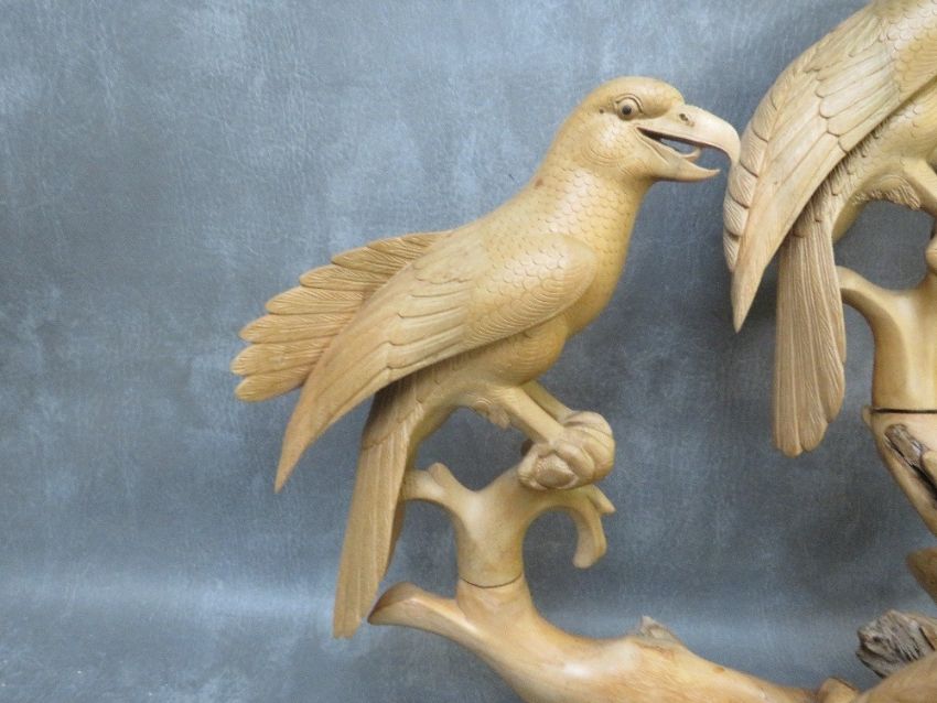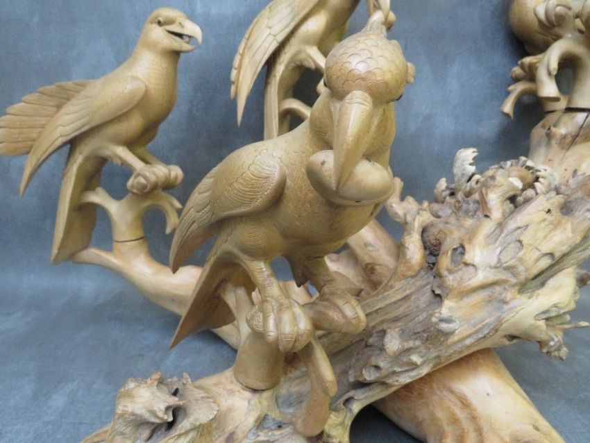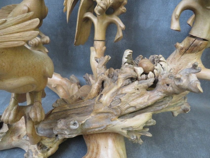 A FINELY CARVED SIX BIRD WOODEN TABLE CENTERPIECE / ORNAMENT, approximate W 67 cm, H 48 cm
