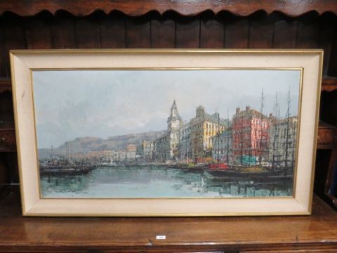 A 20TH CENTURY CONTINENTAL SCHOOL COASTAL TOWN HARBOUR SCENE, with moored sailing vessels, signed lower left, oil on canvas, framed, 59 x 121 cm