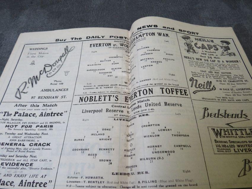 AN 8TH NOVEMBER 1930/1931 SEASON EVERTON v WOLVERHAMPTON WANDERERS SECOND DIVISION FOOTBALL PROGRAMME, in which Dixie Dean played for Everton, the programme also features Liverpool Reserves v Leeds United Reserves