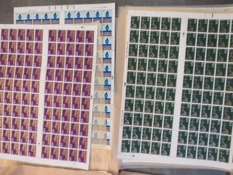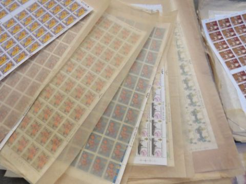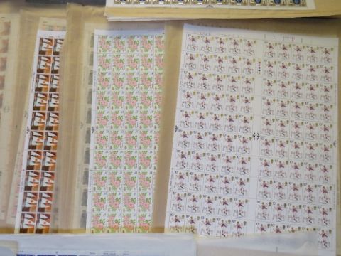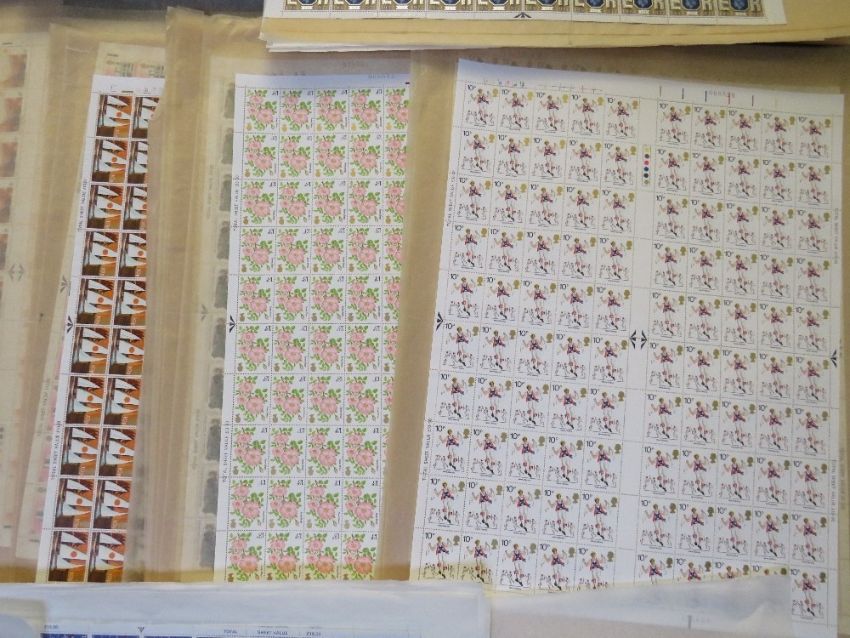 APPROXIMATELY 185 SHEETS OF UNUSED QUEEN ELIZABETH II ROYAL MAIL COMMEMORATIVE STAMPS, each sheet having 100 stamps with various denominations of the period, all sheets divided by soft greaseproof paper at time of consignment