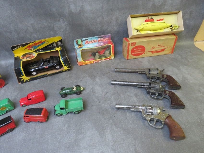 MIXED TOY LOT TO INCLUDE UNBOXED DINKY CARS, two tin plate items - Frontier Express and Shell Tanker, Ertl Smokey & The Bandit Car (Box A/F), Matchbox Battlekings K117 Hawk missile launcher, boxed Sutcliffe Sea Wolf atomic submarine and three toy hand guns by Ideal and Treber