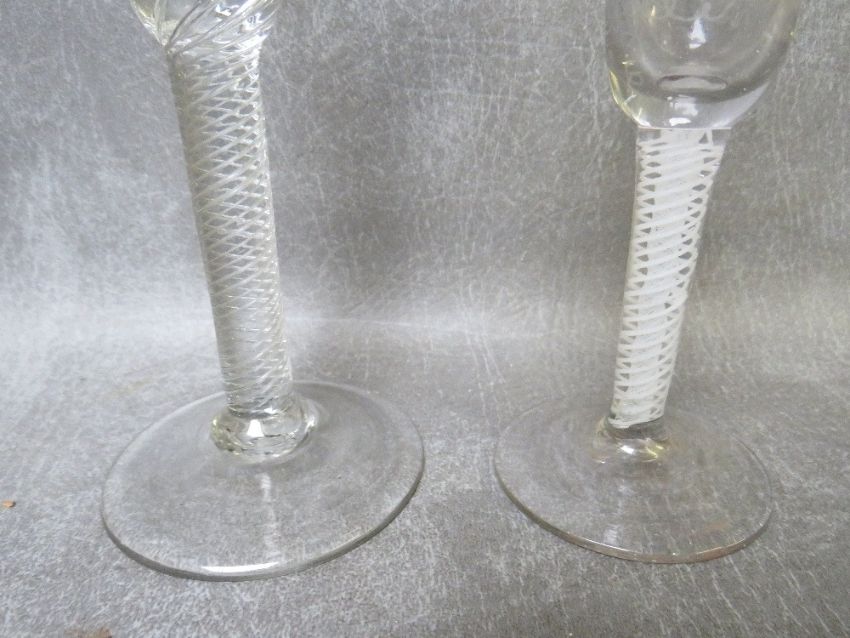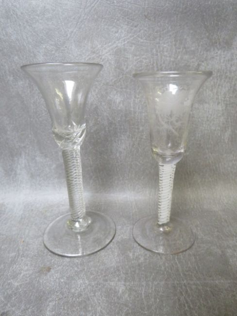 TWO GEORGIAN WINE GLASSES WITH AIR TWIST STEMS, one with etched vine and leaf detail, tallest H 17 cm (2)